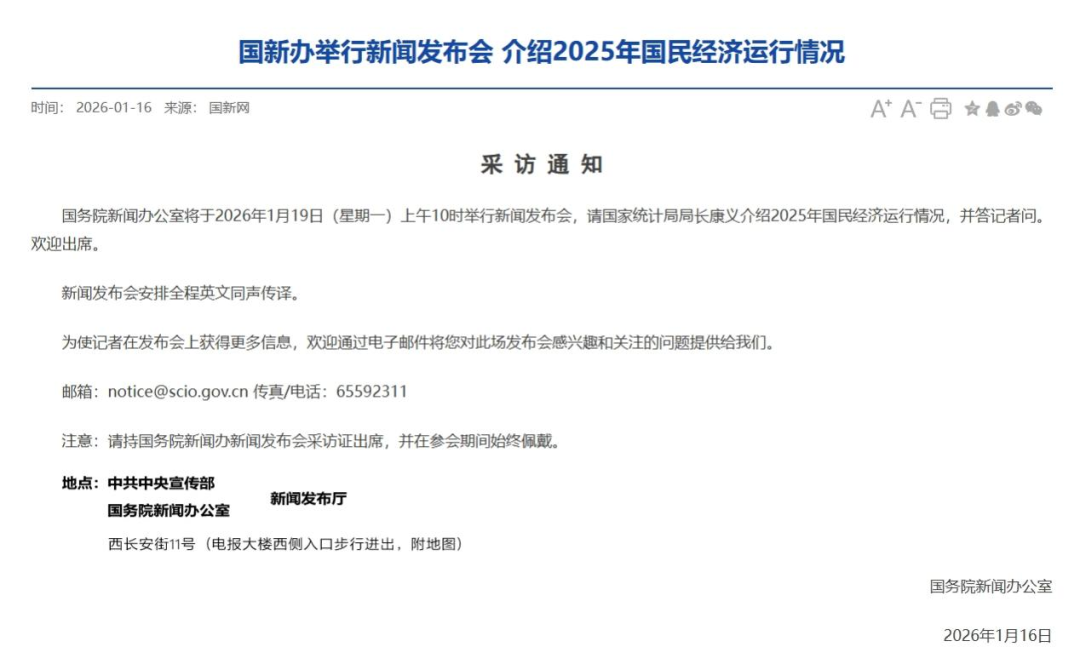 中国证券报记者1月16日从国新办获悉,国务院新闻办公室将于1月19日(星期一)上午10时举行新闻发布会,国家统计局局长康义介绍2025年国民经济运行情况,并答记者问。